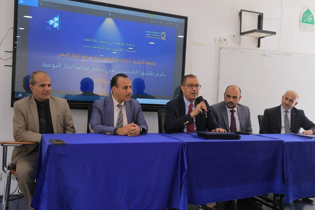 في خطوة تجسد التزامها بصناعة جيل قادر على المنافسة وصناعة المستقبل، كرّمت جامعة الرشيد الذكية وبالشراكة مع منصة إنجاز اليمن اليوم الأربعاء 22 ابريل 2026م، طلبتها المتدربين والمتميزين في برامج منصة إنجاز اليمن، وذلك برعاية رئيس الجامعة الأستاذ الدكتور عبداللطيف حيدر، في فعالية عكست حرص الجامعة على الاستثمار الحقيقي في الإنسان قبل الشهادة.