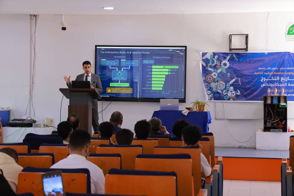 في خطوة تعكس توجه جامعة الرشيد الذكية نحو دعم المشاريع النوعية التي تربط المعرفة الهندسية باحتياجات التنمية المستدامة، وبرعاية كريمة من رئيس الجامعة الأستاذ الدكتور عبداللطيف حيدر، وبحضور عميد مركز التطوير وضمان الجودة الأستاذ الدكتور عبدالحميد الشجاع، شهدت كلية الهندسة والتكنولوجيا اليوم الاثنين 20 ابريل 20w6م مناقشة مشروع تخرج متميز لطلبة الدفعة الأولى في قسم هندسة الميكاترونكس بعنوان “نظام الري الذكي باستخدام الذكاء الاصطناعي وإنترنت الأشياء”، والذي قدم رؤية تقنية متقدمة لمستقبل الزراعة الذكية وإدارة الموارد بكفاءة أعلى.