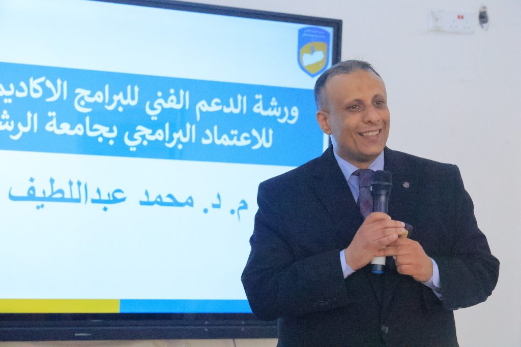 في رحاب جامعة الرشيد الذكية، حيث تتقاطع الطموحات مع الرؤى الاستراتيجية، وتتحول التطلعات الأكاديمية إلى خطوات عملية نحو المستقبل، تتواصل مسيرة الجامعة لترسيخ ثقافة الجودة وبناء صروح الاعتماد الأكاديمي. وفي هذا السياق، وبالتعاون مع مجلس الاعتماد الأكاديمي وضمان جودة التعليم العالي، نظمت الجامعة اليوم الأربعاء 25 ربيع الأول 1447هـ الموافق 17 سبتمبر 2025م ورشة تدريبية موسعة خُصصت للدعم الفني في إعداد دراسة التقييم الذاتي لسبعة برامج مقدمة للاعتماد البرامجي وهي: (طب مخبري، تقنية المعلومات، جرافيكس وملتميديا، إدارة أعمال دولية باللغة الإنجليزية، إداراة أعمال باللغة العربية، محاسبة باللغتين العربية والإنجليزية).