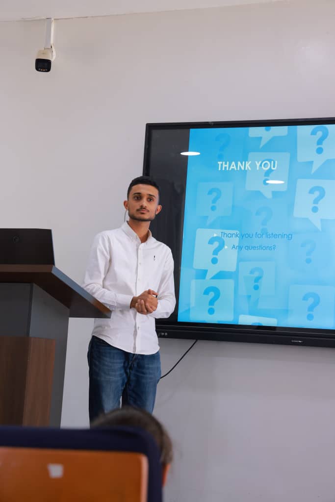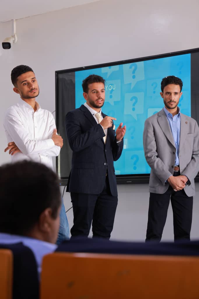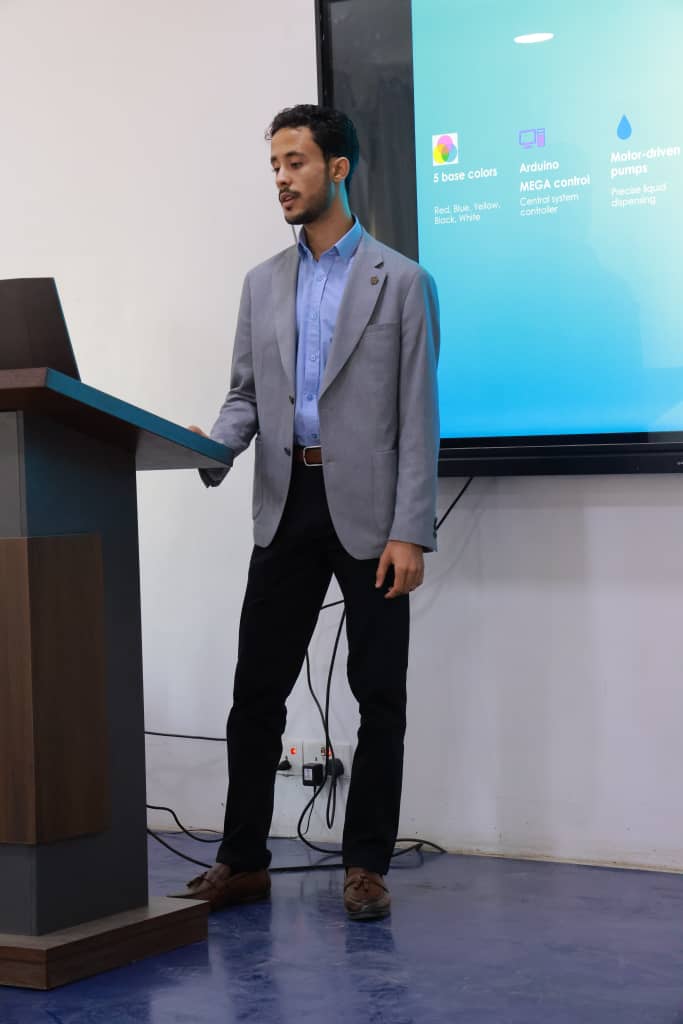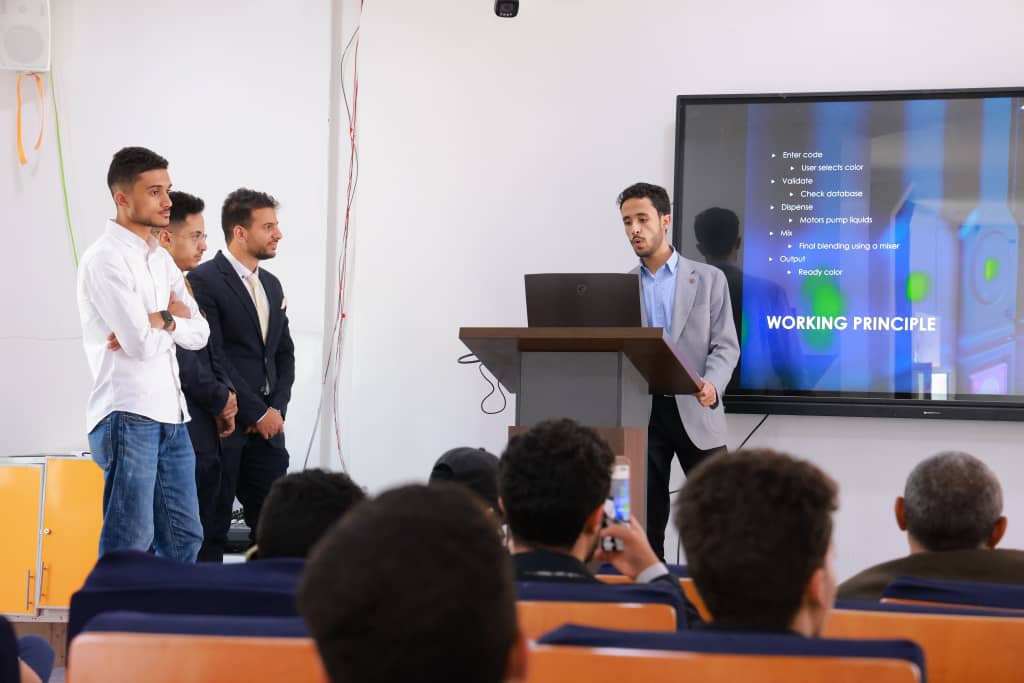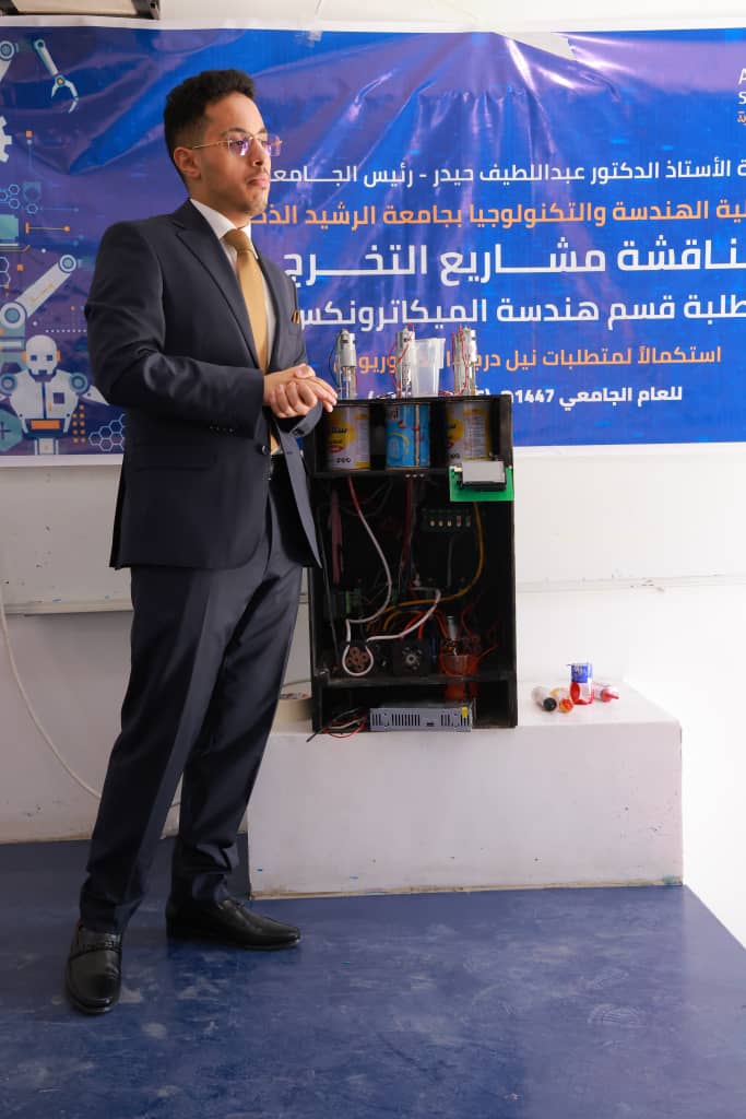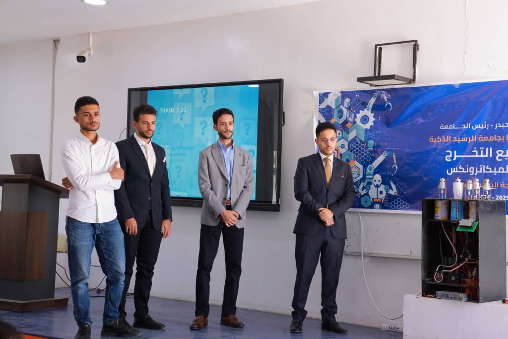 في تجسيدٍ جديد لقدرة الابتكار الهندسي على تحويل التفاصيل اليومية إلى حلول ذكية، شهدت جامعة الرشيد الذكية اليوم الاثنين 20 ابريل 2026م، وبرعاية كريمة من رئيس الجامعة الأستاذ الدكتور عبداللطيف حيدر، وبحضور عميد مركز التطوير وضمان الجودة الأستاذ الدكتور عبدالحميد الشجاع، مناقشة مشروع تخرج متميز لطلبة الدفعة الأولى بقسم هندسة الميكاترونكس في كلية الهندسة والتكنولوجيا بعنوان “آلة مزج الألوان الذكية”.