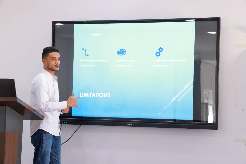 وأوضحت المجموعة الطلابية المكونة من أدهم الصلوي، علي المسيبي، محمد المداني، وفارس المنصور أن المشروع جاء لمعالجة تحديات تقليدية في مجال مزج الألوان، أبرزها صعوبة إعادة إنتاج اللون نفسه، وتأثر النتائج بالعوامل البشرية، إضافة إلى هدر المواد وارتفاع التكلفة التشغيلية. وتم تصميم النموذج ليجمع بين الدقة، وسهولة الاستخدام، وانخفاض التكلفة، مع قابلية للتطوير في التطبيقات الصناعية والتعليمية.