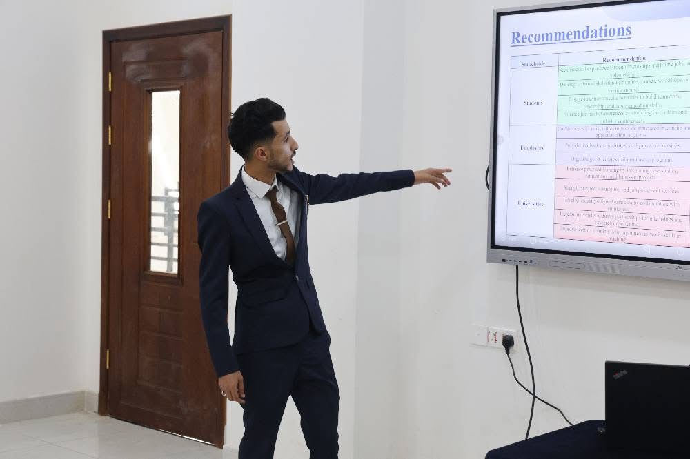 أخبار الجامعةفي خطوة تعكس التزام جامعة الرشيد الذكية بتعزيز مهارات التوظيف لدى طلابها، ناقش قسم إدارة أعمال دولية (إنجليزي) بكلية المال والأعمال، اليوم الأربعاء 19 فبراير 2025م، مشروع بحث التخرج بعنوان: “تقييم جاهزية طلاب الأعمال لسوق العمل: دراسة حول تنمية مهارات التوظيف بين طلاب الجامعات اليمنية الخاصة” (Assessing Business Students Preparedness for the Workforce: A Study on Employability Skills Development among Yemeni Private University Students)، وذلك استكمالًا لمتطلبات الحصول على درجة البكالوريوس للعام الدراسي 1446هـ (2024 – 2025م). حظيت المناقشة بحضور لجنة التقييم، التي ضمت الدكتور صلاح سند (مشرفًا)، والدكتور زياد البخيتي (مناقشًا خارجيًا)، والدكتور جمال الدعيس (مناقشًا داخليًا)، بالإضافة إلى ممثلين من سوق العمل، من بينهم الدكتور مصطفى حُميد، رئيس قسم العلاقات والبنوك المراسلة في كاك الإسلامي. كما شهدت الفعالية حضور عدد من أولياء الأمور وطلبة القسم، في أجواء أكاديمية ثرية بالحوار والنقاشات الهادفة. وخلال الافتتاح، أعرب عميد كلية المال والأعمال، الأستاذ الدكتور عبدالخالق هادي طواف، عن فخره بجهود الطلبة في إعداد أبحاث تتناول قضايا جوهرية تمس مستقبلهم المهني، مشيرًا إلى أهمية تنمية المهارات الوظيفية لمواكبة متطلبات سوق العمل المتسارع. كما أكد على حرص الجامعة على توفير بيئة تعليمية تُعزز من كفاءة طلابها، مما يسهم في تأهيلهم ليكونوا روادًا في مجالاتهم. وخلال المناقشة، قدمت المجموعة الطلابية، المكونة من نجم الدين صادق السفياني، عمر سالم العرقبان، بسام علي المملوك، الحسين علي القوطاري، هيثم أحمد السنحاني، وسهيل باسل علوي، عرضًا متميزًا لمشروعهم البحثي، الذي يشكل إضافة علمية نوعية تسلط الضوء على أبرز التحديات التي يواجهها طلاب إدارة الأعمال عند الانتقال إلى سوق العمل. ويكتسب البحث أهمية كبيرة لتناوله إحدى القضايا الملحة التي تواجه الشركات العاملة في اليمن، حيث تعاني من فجوة واضحة بين متطلبات سوق العمل ومخرجات التعليم الجامعي. وقد قدمت الدراسة حلولًا مبتكرة لتعزيز جاهزية الخريجين، بما يتماشى مع رؤية الجامعة في تأهيل كوادر قادرة على المنافسة والنجاح في بيئات العمل الحديثة. وأشادت لجنة المناقشة بجودة البحث وأسلوب تقديمه، مثنيةً على الجهود التي بذلها الطلاب في إعداد المشروع وعرضه بأسلوب احترافي. وأكدت اللجنة أن البحث لا يقتصر على كونه دراسة أكاديمية، بل يمثل نموذجًا عمليًا يمكن الاستفادة منه في تطوير مهارات التوظيف لدى الطلاب. كما أعربت عن تمنياتها لجميع الطلبة بمستقبل مشرق حافل بالنجاحات والإنجازات المتميزة.