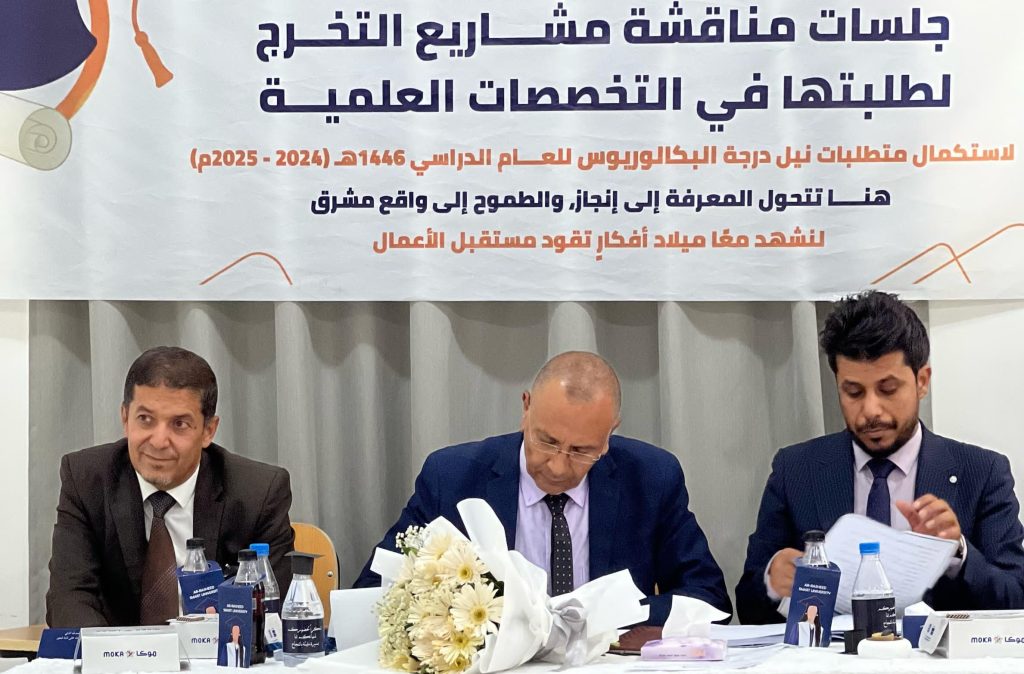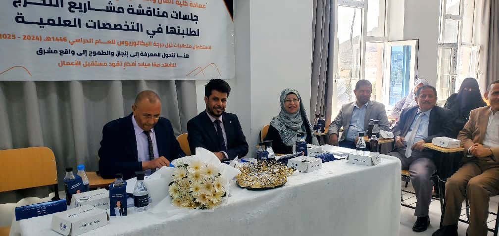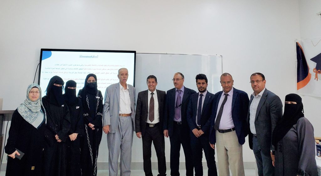 For their part, the discussion committee, consisting of Dr. Najat Al-Aoudi (research supervisor), Dr. Jamal Al-Do'ais, Dr. Noman Ghallab, and Dr. Salah Sand, praised the quality of the study and its direct relevance to the practical reality of the university, describing it as “a comprehensive research model that connects theory to practice.”