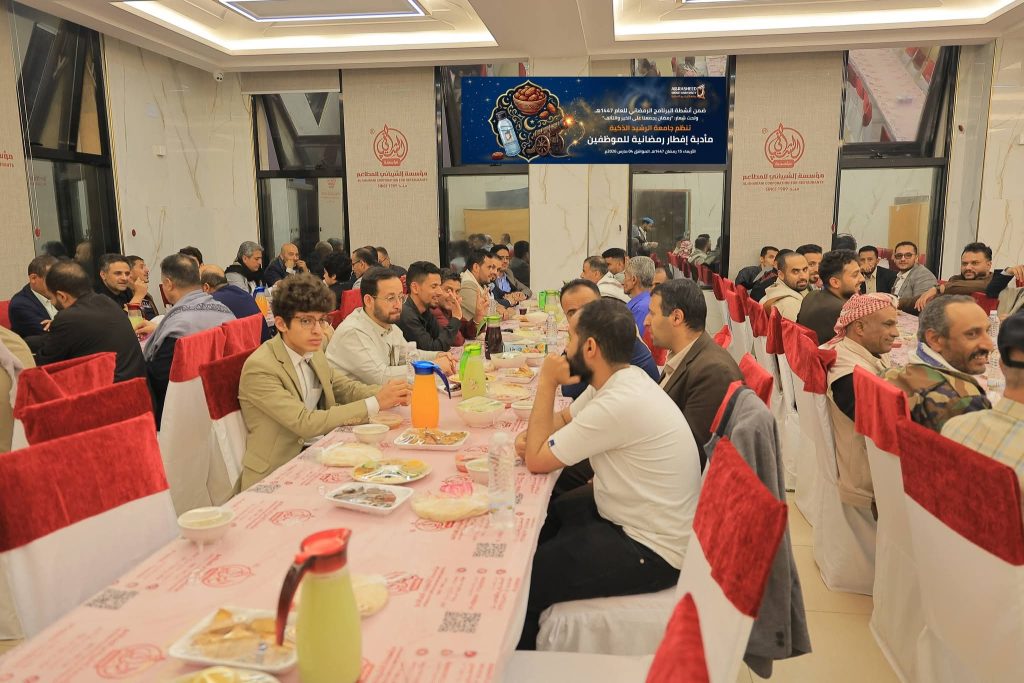 وفي هذا السياق، وضمن أنشطة البرنامج الرمضاني للعام 1447هـ، وتحت شعار: «رمضان يجمعنا على الخير والتآلف»، نظّمت جامعة الرشيد الذكية اليوم الأربعاء 15 رمضان 1447هـ الموافق 04 مارس 2026م، مأدبة إفطار رمضانية للموظفين الأكاديميين والإداريين، في لقاءٍ جسّد روح الأسرة الواحدة، وعكس اهتمام قيادة الجامعة بتعزيز أواصر الأخوّة والتواصل بين منتسبيها.