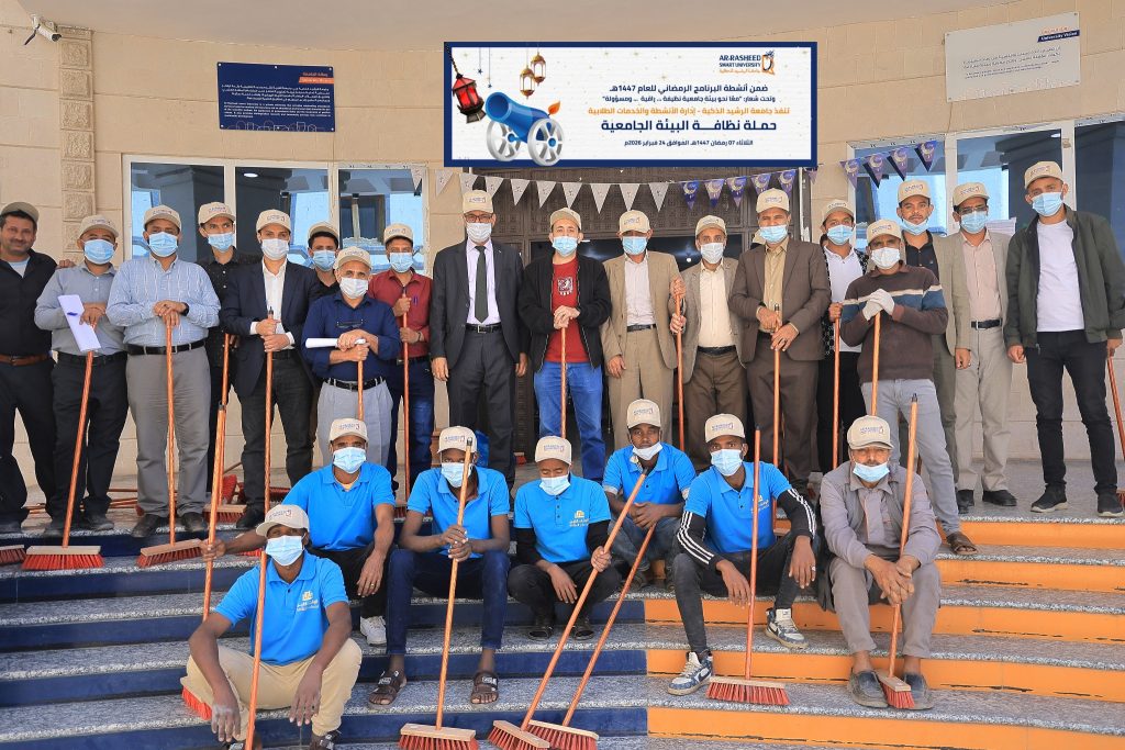 في مشهد يعكس روح العطاء وقيم التكافل التي يجسدها شهر رمضان المبارك، نفذت جامعة الرشيد الذكية، ممثلة بإدارة الأنشطة والخدمات الطلابية، اليوم الثلاثاء 24 فبراير 2026م، حملة نظافة البيئة الجامعية، وذلك ضمن برنامجها الرمضاني للعام 1447هـ، تأكيدًا لدورها المجتمعي والتربوي في ترسيخ ثقافة النظافة والانتماء والمسؤولية.