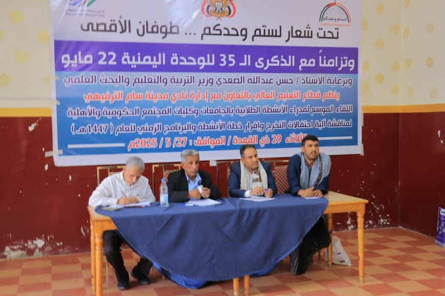 Held under the slogan "You Are Not Alone" and marking the 35th anniversary of the establishment of the Republic of Yemen, the meeting discussed mechanisms for organizing graduation ceremonies at universities and educational institutions. It also approved the student activities plan and schedule for the 1447 academic year, aiming to strengthen national identity and ethical values among students.