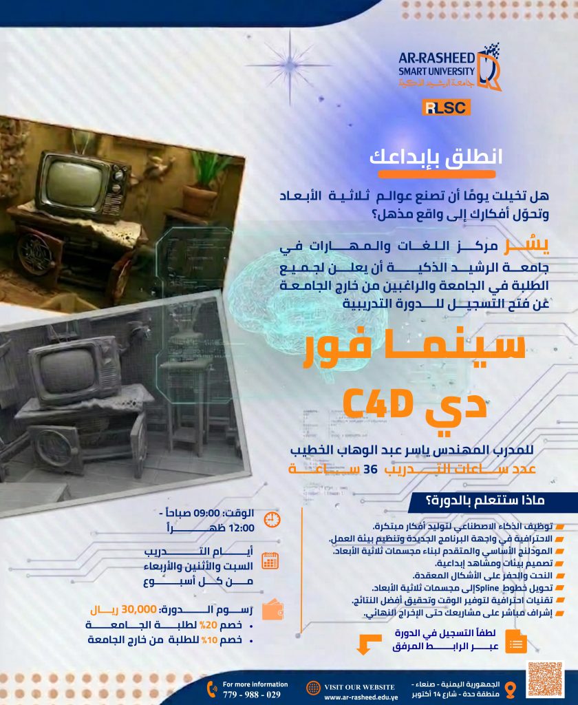 Announcementsمركز اللغات والمهارات بجامعة الرشيد الذكية يطلق دورة احترافية في تصميم النماذج ثلاثية الأبعاد باستخدام Cinema 4D انطلق_بإبداعك هل تخيلت يومًا أن تصنع عوالم ثلاثية الأبعاد وتحوّل أفكارك إلى واقع مذهل؟ الآن فرصتك لتتعلم تصميم النماذج ثلاثية الأبعاد بطريقة احترافية مع المهندس ياسر عبد الوهاب الخطيب في دورة #سينمافوردي_C4D بمركز اللغات والمهارات – جامعة الرشيد الذكية. ✨ اكتشف أسرار التصميم ثلاثي الأبعاد من البداية وحتى إخراج مشاريع رائعة جاهزة للعرض الاحترافي. 🎯 ماذا ستتعلم في الدورة؟▫️توظيف الذكاء الاصطناعي لتوليد أفكار مبتكرة.▫️الاحترافية في واجهة البرنامج الجديدة وتنظيم بيئة العمل.▫️المودلنج الأساسي والمتقدم لبناء مجسمات ثلاثية الأبعاد.▫️تصميم بيئات ومشاهد إبداعية.▫️النحت والحفر على الأشكال المعقدة.▫️تحويل خطوط Spline إلى مجسمات ثلاثية الأبعاد.▫️تقنيات احترافية لتوفير الوقت وتحقيق أفضل النتائج.▫️إشراف مباشر على مشاريعك حتى الإخراج النهائي. ⏳ عدد ساعات التدريب: 36 ساعة🕘 الوقت: 09:00 صباحاً – 12:00 ظهراً🗓 أيام التدريب: السبت – الاثنين – الأربعاء 💰 الرسوم: 30,000 ريال🎓 خصومات خاصة:20% لطلبة جامعة الرشيد الذكية10% للطلبة من خارج الجامعة ✨ هذه فرصتك لتصبح مصممًا ثلاثي الأبعاد متمكنًا، ولتحويل خيالك إلى واقع بصري رائع. 📌 سجل الآن عبر الرابط .. وابدأ رحلتك نحو الاحتراف: https://forms.gle/CCjWYgd2kiYUsVfQ6